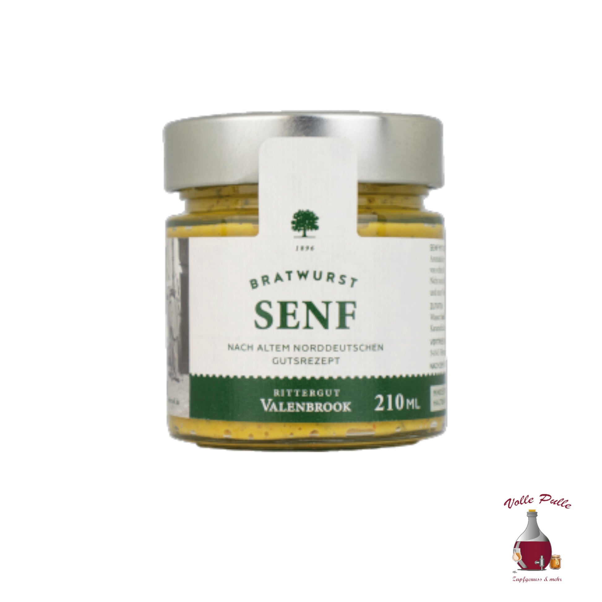 Was isst man zu einer richtig guten Bratwurst? Genau, einen richtig guten Senf – kreiert von bekennenden Bratwurst-Fans in der Manufaktur des Rittergutes Valenbrook. Und – nach einem alten norddeutschen Gutsrezept. Fein-würzig mit einer milden Schärfe, angenehmer Säure und mit einer feinen Kräuternote ist dieser Senf einfach ideal zu Bratwurst. Ob du dazu eine grobe Wurst, eine klassische Rostbratwurst oder die Veggie-Variante bevorzugst, überlassen wir dir. So oder so: auf unseren Bratwurst Senf wirst du künftig nicht mehr verzichten wollen, versprochen!